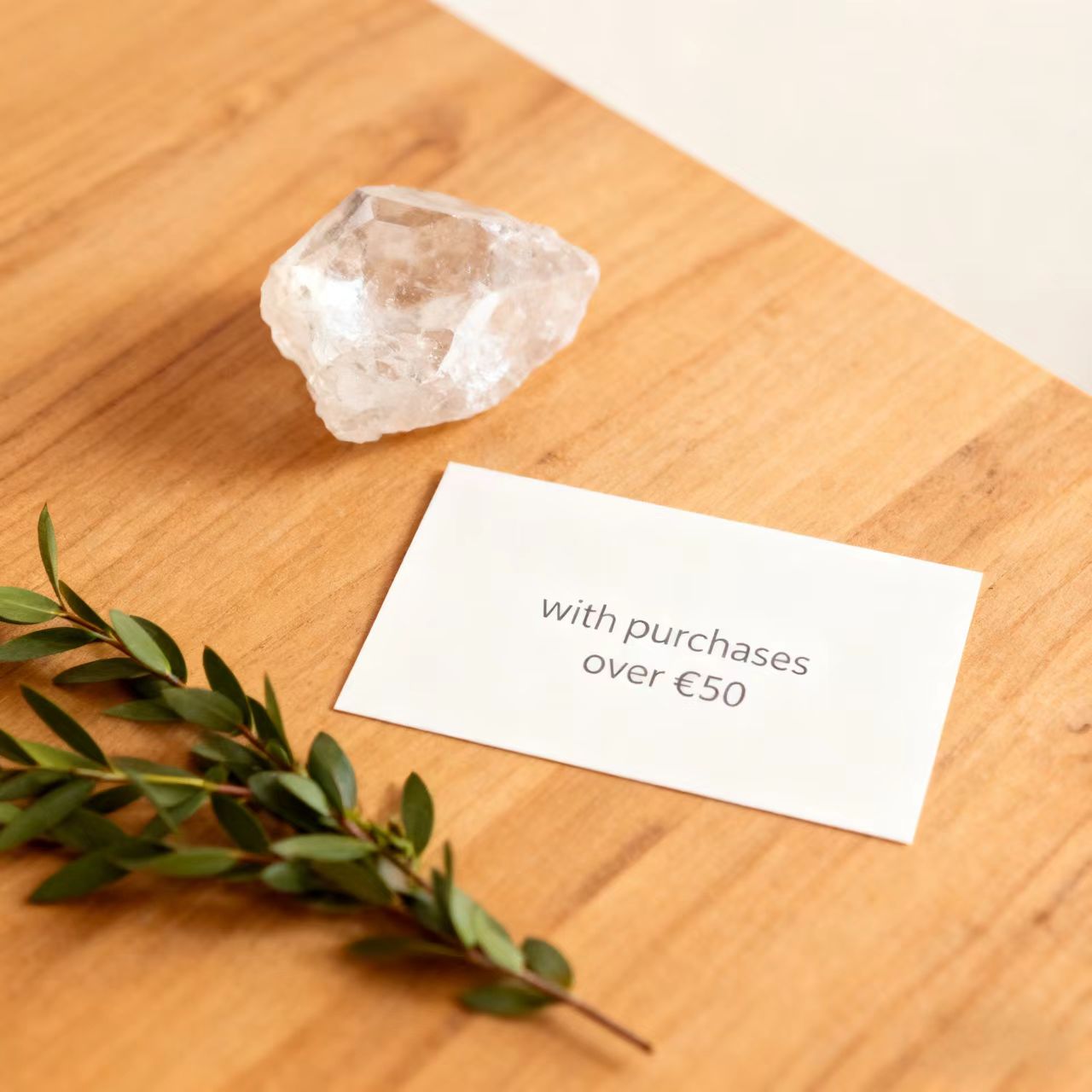 As a token of our appreciation for your support, receive a complimentary de-magnetizing crystal and maintenance herbs with purchases over €50. The de-magnetizing crystal helps cleanse your items of negative energy, bringing them back to life, while the maintenance herbs enhance the longevity of your purchases, keeping them in their best condition. A thoughtful gift with big intentions, offering you the care and attention you deserve!