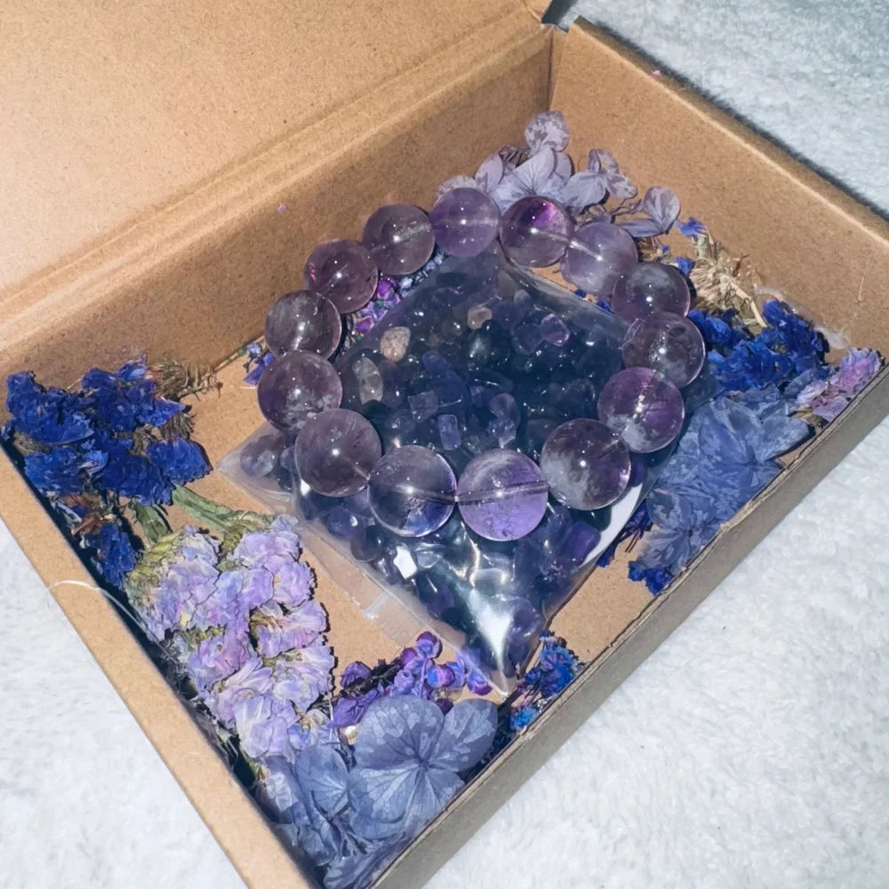 — Our packaging combines dried flowers, crystal bracelets, and cleansing stone chips, creating a ritual-like unboxing experience. The dried flowers bring natural elegance, while the crystal chips help to dispel negative energy and recharge your piece.
